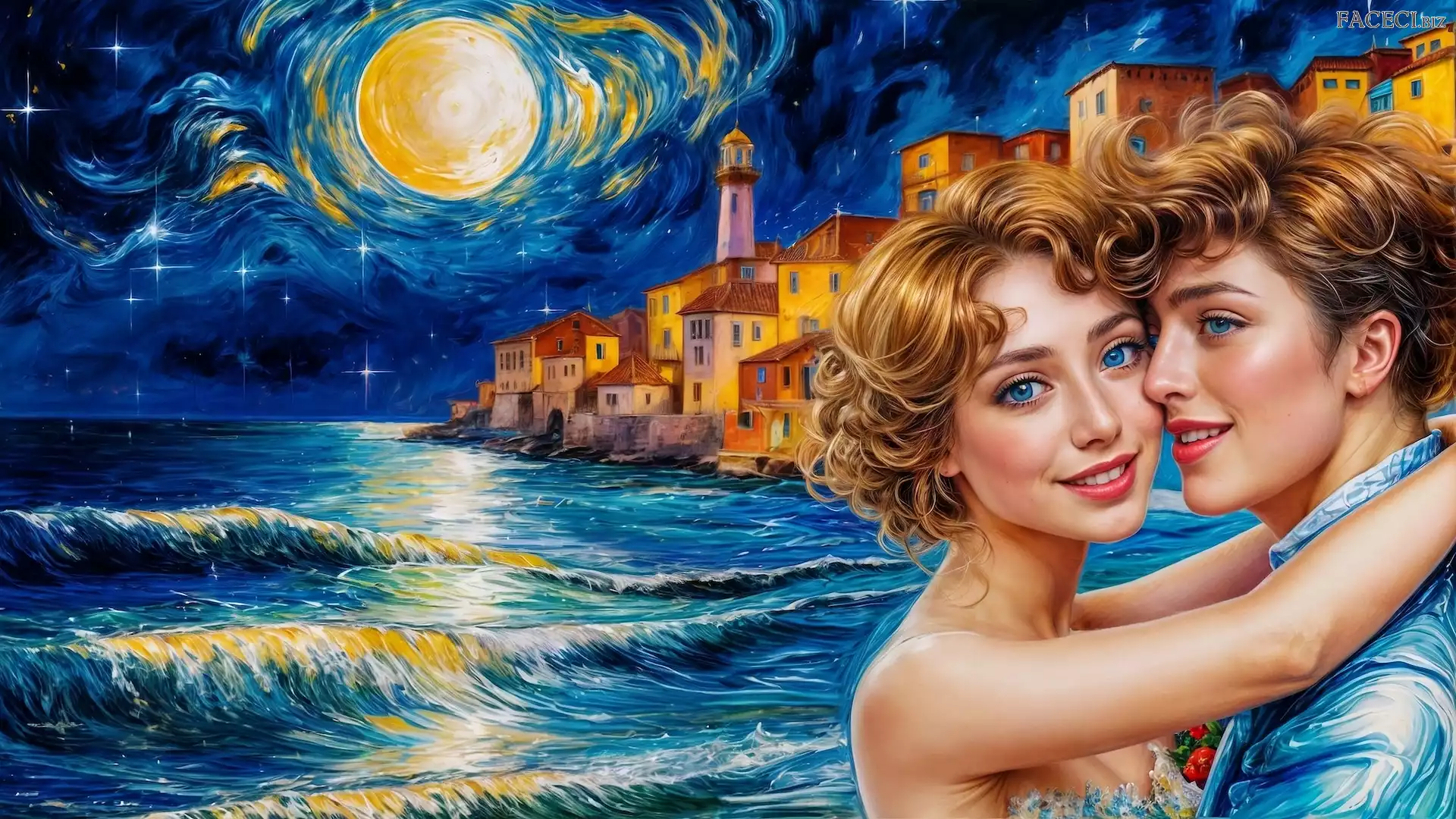 Księżyc, Morze, Domy, Grafika, Zakochani, Kobieta, Para, Mężczyzna - faceci.biz